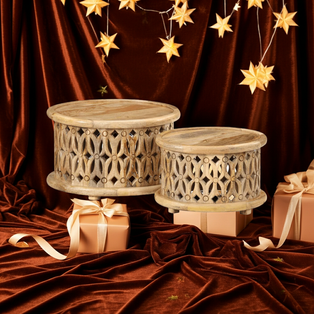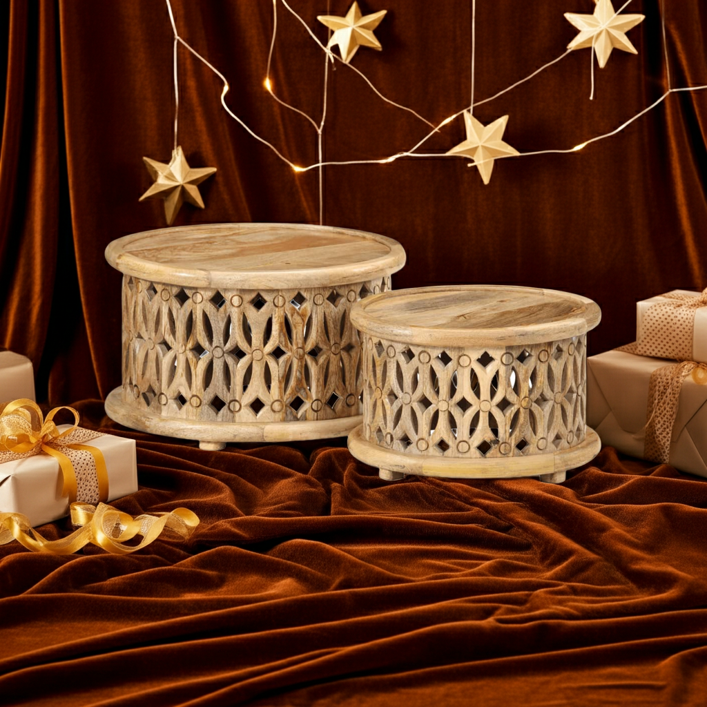 This wooden coffee table set has a distinctive design and will add a touch of retro style to your interior. Solid mango wood: Solid mango wood is a strong, tropical hardwood that makes sturdy furniture. Its beautiful wood grains make every piece of furniture slightly different from the next.Smooth table top: The smooth table top is easy to clean with a damp cloth and is perfect for placing food, drinks and other decorative items.Wide applications: This side table can be used as a couch table, end table or living room table. Good to know:Colours and grains vary per furniture item, making each piece unique. The delivery is random, ensuring the exclusivity and individuality of your product.